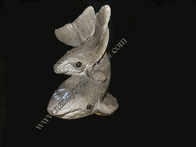 This is a Stone Critter Littles figurine named Whale with Baby. It is a whale mother with her baby on her back. It is in excellent condition; no chips or repairs. It measures 2-1/4" tall, 2-1/2" long. It is stamped "93, UDC". The United Design label states "Stone Critter Littles,SCL-135,Whale Baby Grey". It also includes the "Made in USA" label. It is in a Stone Critter Box.