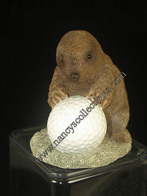 This is a Stone Critter Mole holding a golf ball. He is brown with his paws on the golf ball. He is in excellent condition; no chips or repairs. He measures 3-1/2" tall, 2-1/2" wide. His label reads "Stone Critters,SC-610,Mole & Golf Ball, United Design Corp.,Noble, Ok.". He is in the Stone Critters box.