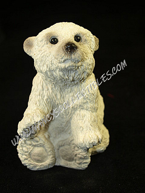 This is a Stone Critter polar bear cub. He is in a sitting position looking up with one paw raised and the other resting on one of his hind legs.He is white with a black nose and eyes. He is in ex- cellent condition; no chips or repairs. He mea- sures 2-3/4" tall, 1-1/2" wide. His label has been removed. It is marked "88 UDC". His identifi- cation number is SCL051.