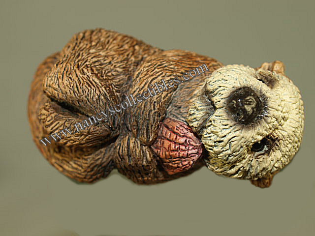 This is a Stone Critters Sea Otter figurine. He is laying on his back attempting to crack open his dinner. He is brown with a white face and has black eyes and nose. It is in excellent condition; no chips or repairs. It measures 1" tall, 2-1/2" long. The label is attached "Stone Critters Littles, SCL-184, Sea Otter,United Design Corp. It is stamped "1993,UDC".