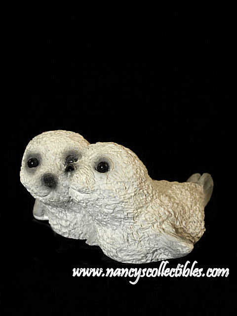 This is a Stone Critter figurine named Harp Seal Babies. It is a pair of baby harp seals with black eyes. It is in excellent condition; no chips or repairs. It measures 1-1/4" tall, 2-3/4" long. It is stamped "1993,UDC". The United Design label states "Stone Critter Littles, SCL-137, Harp Seal Babies". It also includes the "Made in USA" label.