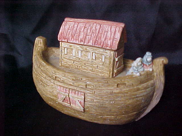 A figurine of the Ark with Noah and his wife on the deck by Stone Critter. It is in very good condition. It has a repair on the bow where it looks like it may have been chipped. It is missing the Stone Critters label, but you can see where it was and it does have the "Made in America" label which always adorns Stone Critters figurines. It measures 3-1/2" long, 1-1/2" deep, and 2-1/2" tall.