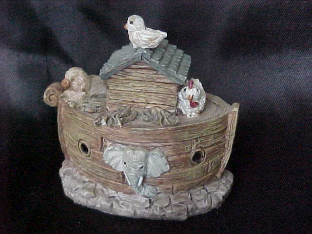 This is a miniature ark which I believe is a Stone Critters piece by United Design Corp. It has a bird sitting on the roof with a hen one side and a pig on the other side. Peering out a window on the side of the ark is an elephant. It is in excellent condition; no chips or repairs. It measure 1-3/4" long, 1-3/4" tall, and 1-1/4" wide. There is no label to verify the maker, but it is typical of the Stone Critters pieces.