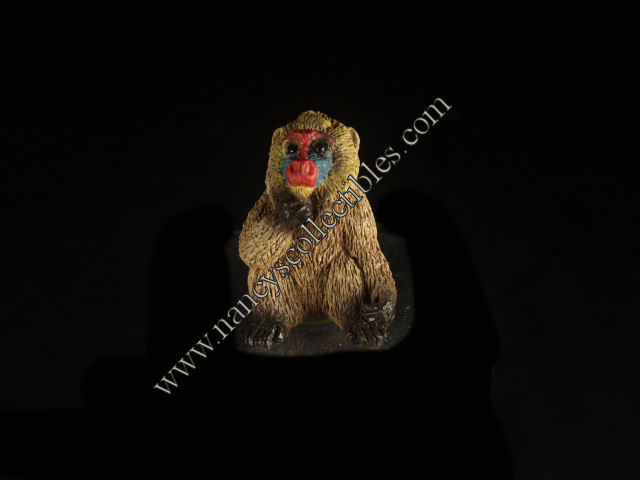 A Stone Critters Mandrill Baboon sitting up with his hand under his chin. He is brown with red and blue coloring on his face. He is in excellent con- dition; no chips or repairs. He measures 2-1/2" tall; 1-1/2" wide. The label states "Stone Critter Littles, Baboon Mandrill, SCL-183". It is in the Stone Critter box.