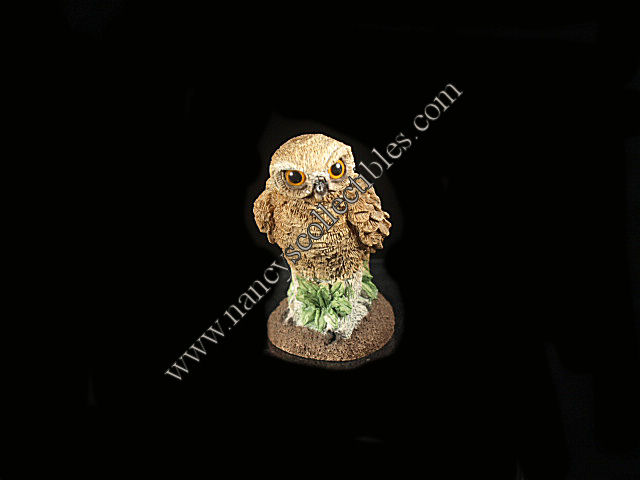 This is an "Owl Burrowing", a Stone Critters piece by United Design Corp. He is in excellent condition; no chips or repairs. He is light brown with yellow eyes. He measures 2" tall; 1-1/4" wide. The label is marked "SCL-203, Stone Critters Littles, Owl Burrowing". It is stamped "1994, UDC". It is in the original box.