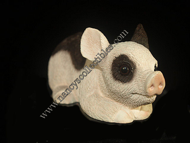 This is a black and white baby pig titled "Pig Baby Black and White", a Stone Critters piece by United Design Corp. He is in excellent con- dition; no chips or repairs. He measures 3" tall; 1-1/2" wide; 3" long. The label states "Stone Critters, Pig Baby B & W, SCB-016. It is marked "1995, UDC, Miller". It is in a Stone Critters box.