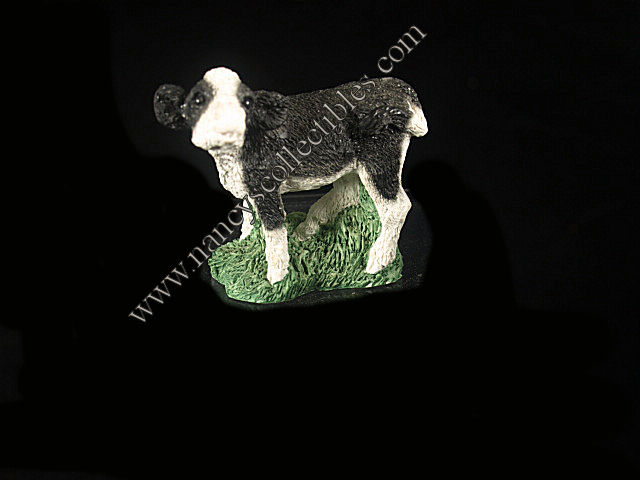 A Stone Critters figurine titled "Calf Black White". It is standing in grass. It is in excellent condition; no chips or repairs. The label states "Stone Critters Littles, SCB-129, Cow B&W,94". It measures 2-1/2" tall, 2-3/4" long. It is in the Stone Critters box.