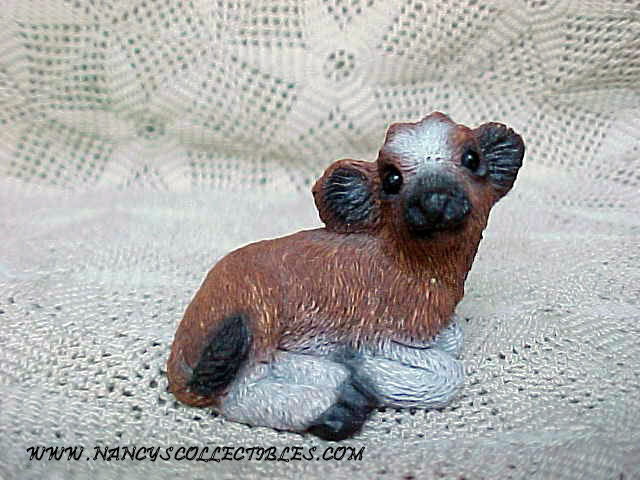 A Stone Critters figurine titled "Calf Brown White". It is laying down. It is in excellent condition; no chips or repairs. The label is missing. He is marked "UDC '88". It measures 1-1/2" tall, 2" long. It is not in a Stone Critters box. The number for this piece is SCL-002.