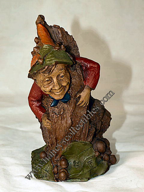 A Cairn Studio artwork of Tom Clark's Gnomes collection. This is "Tank". For the story of Tom Clark Gnome "Tank" click here He is wearing a red hat, blue shirt, brown pants, and black boots. The base is covered in brown, red, and green leaves with scattered acorns. The number for this piece is "66", dated 1987. It is in excellent, like-new condition. He measures 6" tall, 6-1/4" long, and 3" wide.