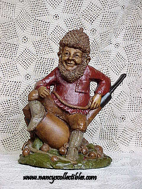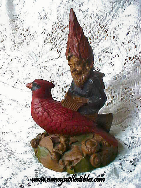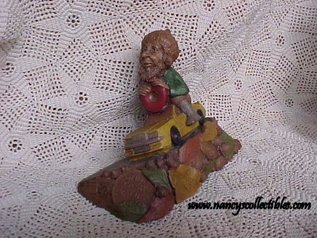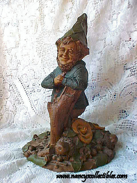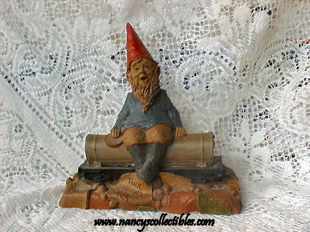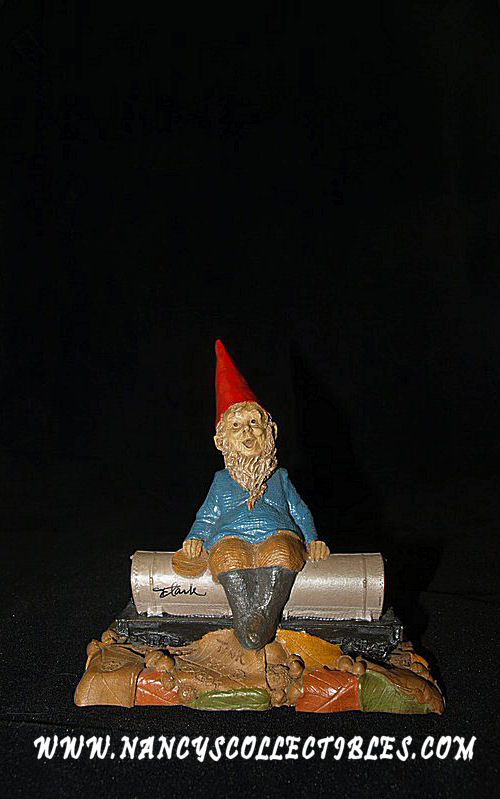 A Cairn Studio artwork of Tom Clark's Gnomes collection. It is personally signed by the artist, Tom Clark. This is "Tank". For the story of Tom Clark Gnome "Tank" click here The number for this piece is "47", dated 1987. It is in ex- cellent, like-new condition. He measures 6" tall, 6-1/4" long, and 3" wide. He is wearing a red hat, blue shirt, brown pants, and black boots. The base is covered in red, brown, and green leaves with scattered acorns. The Certif- icate of Authenticity and story card provided by Cairn Studios is included.