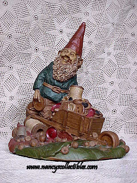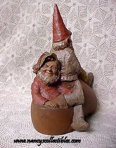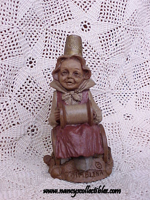 A Cairn Studio artwork of Tom Clark's Gnomes collection. This is "Thimblena". For the story of Tom Clark Gnome "Thimblena" click here The number for this piece is "67", dated 1988. She measures 3-1/4" tall and 2" in diameter. It is in excellent, like-new condition. A Certificate of Authenticity from Cairn Studio, Ltd. is included.
