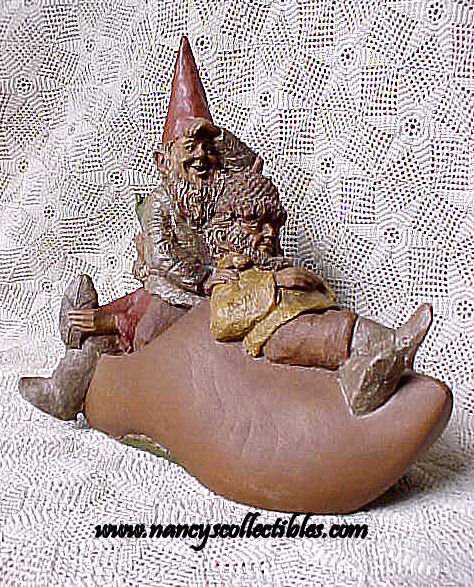 A Cairn Studio artwork of Tom Clark's Gnomes collection. This is "Winkin, Blinkin and Nod". For the story of Tom Clark Gnome "Winkin, Blinkin, and Nod" click here The number for this piece is "11", dated 1984. It measures 7-1/2" tall and 7-1/2" wide. It is in excellent, like-new con- dition. A Certificate of Authenticity from Cairn Studio, Ltd. is included.