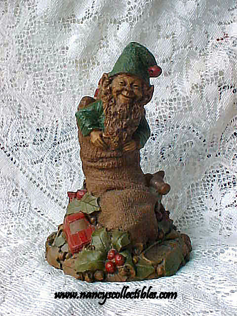 A Cairn Studio artwork of Tom Clark's Gnomes collection. This is "Yule". For the story of Tom Clark Gnome "Yule" click here He has large pointed ears and is wearing a green hat with a red bell on the tip. The stocking has candycanes sticking out the back. There are sev- eral toys around the stocking; toy truck, wooden horse, doll, and wrapped packages. The base is covered in acorns, pecans, and holly leaves and berries. The number for this piece is "88", dated 1984. It is in excellent, like-new condition. It is in its original box. He measures 7-1/2" tall and 5-1/2" in diameter. The Certificate of Authenticity from Cairn Studio, Ltd. is included.